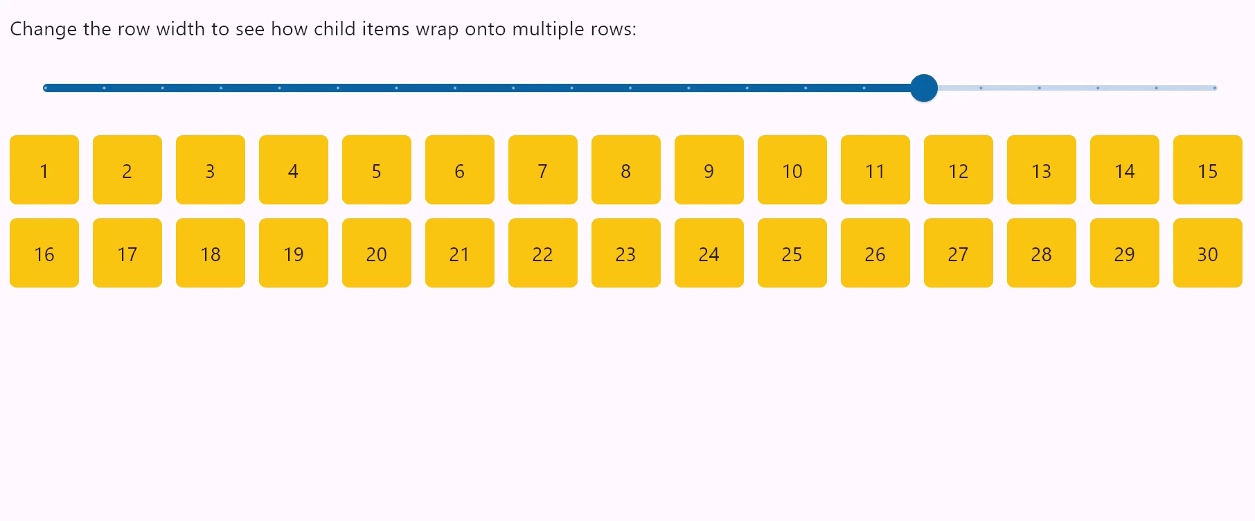 "Change the row width to see how child items wrap onto multiple rows:"